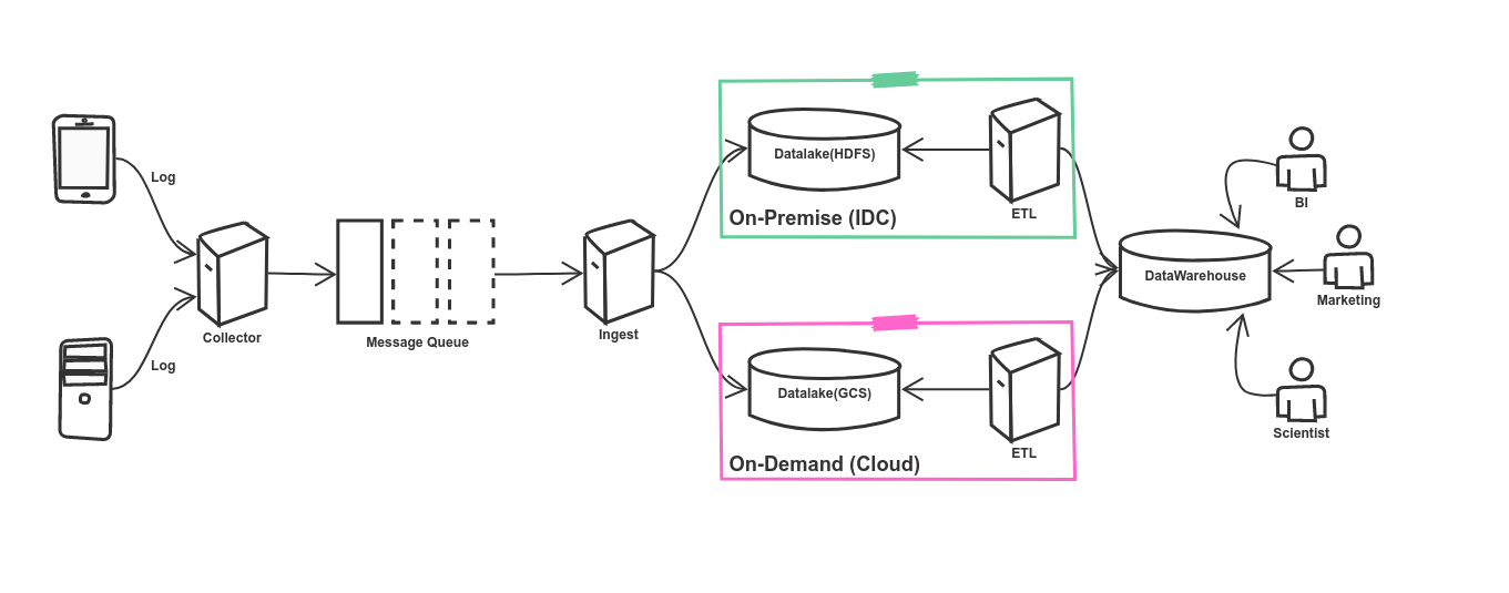 - 데이터 저장: 처리된 데이터는 분석이나 조회를 위해 저장됩니다. 이 과정에서는 Data Warehouse와 같은 시스템을 사용할 수 있습니다.