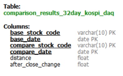 base_stock_code : 비교 기준이 되는 종목의 코드base_date : 비교 기준이 되는 종목의 기준날짜compare_stock_code : 비교 기준과 비슷한 차트를 가진 종목의 코드compare_date : 비교 기준과 비슷한 차트를 가진 종목의 기준날짜distance : 유사도의 반대개념after_close_change : 향후 주가 변동률