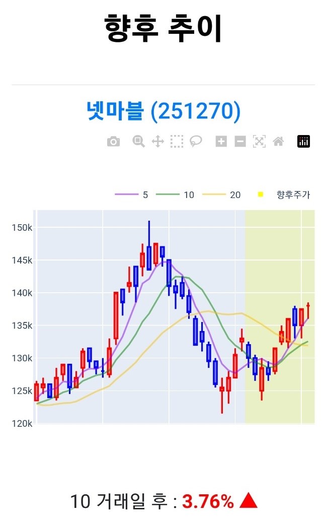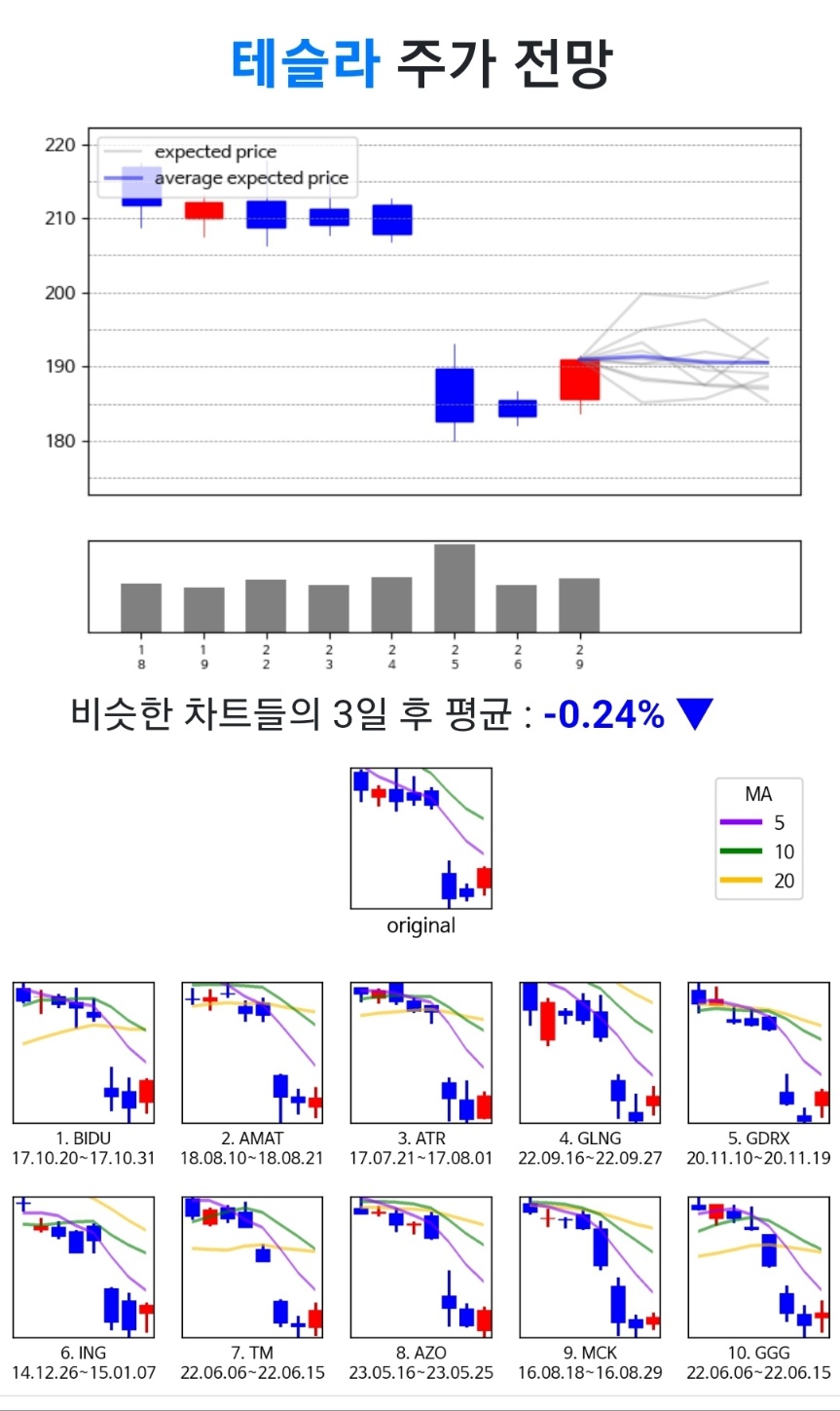 - 특정 종목의 차트와 가장 비슷한 과거 차트를 10개 탐색하여 보여줍니다.