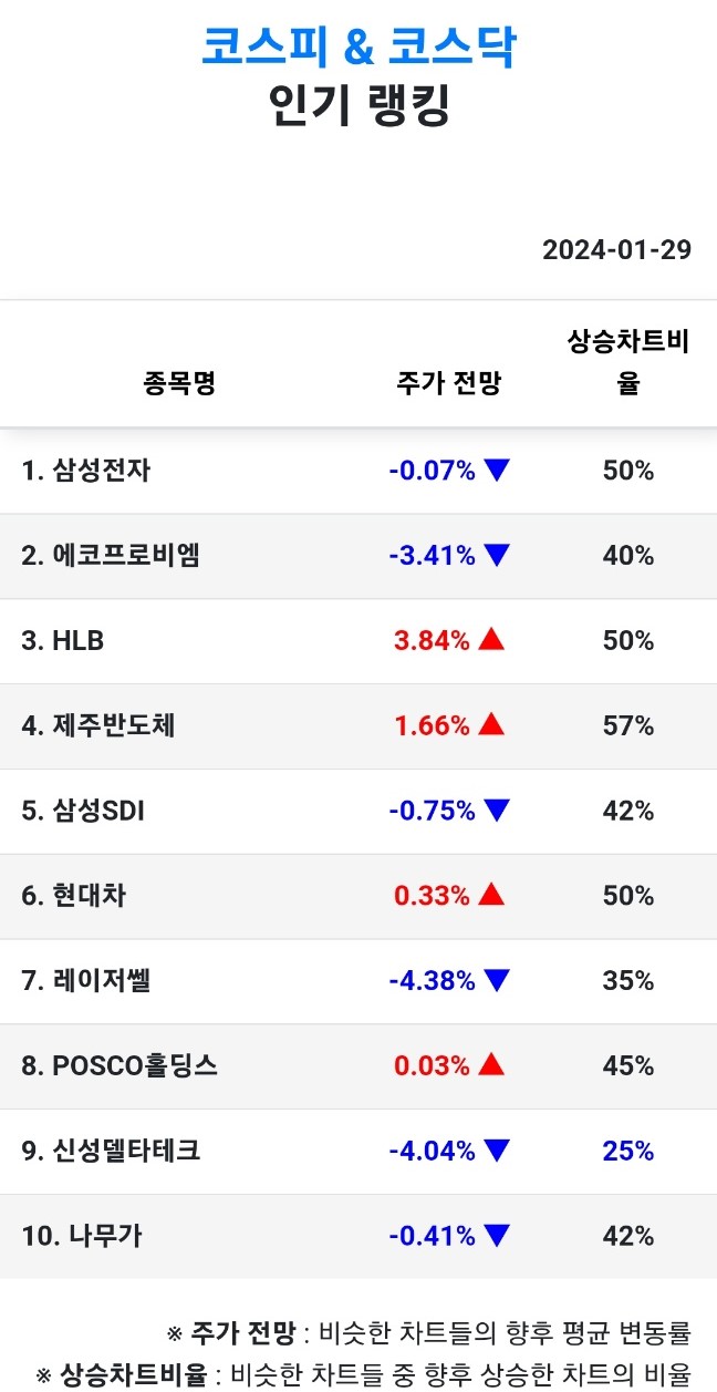 - 맨 오른쪽 항목인 변동률을 클릭하면 해당 차트의 향후 주가 추이를 그래프로 볼 수 있습니다.