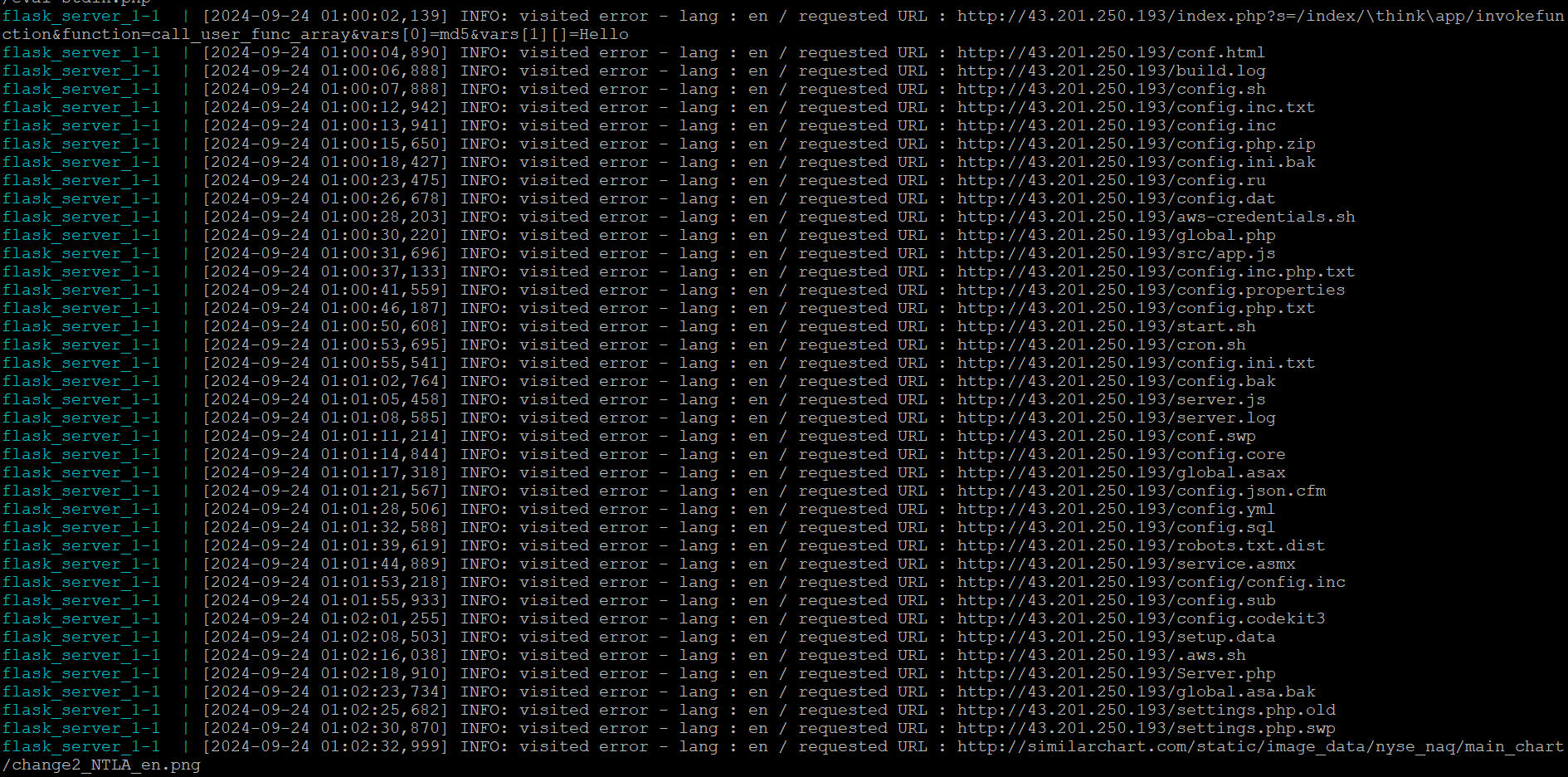 공격 중에는 URL에 특정 중요 파일 경로를 탐색하려는 시도가 있었습니다. 하지만 Flask는 라우팅 데코레이터를 사용하여 URL과 뷰 함수를 명시적으로 매핑합니다. 따라서 정의되지 않은 경로에 대한 요청은 기본적으로 404 Not Found 에러를 반환합니다. 그래서 명시적으로 지정한 URL만 허용하도록 설정했습니다.