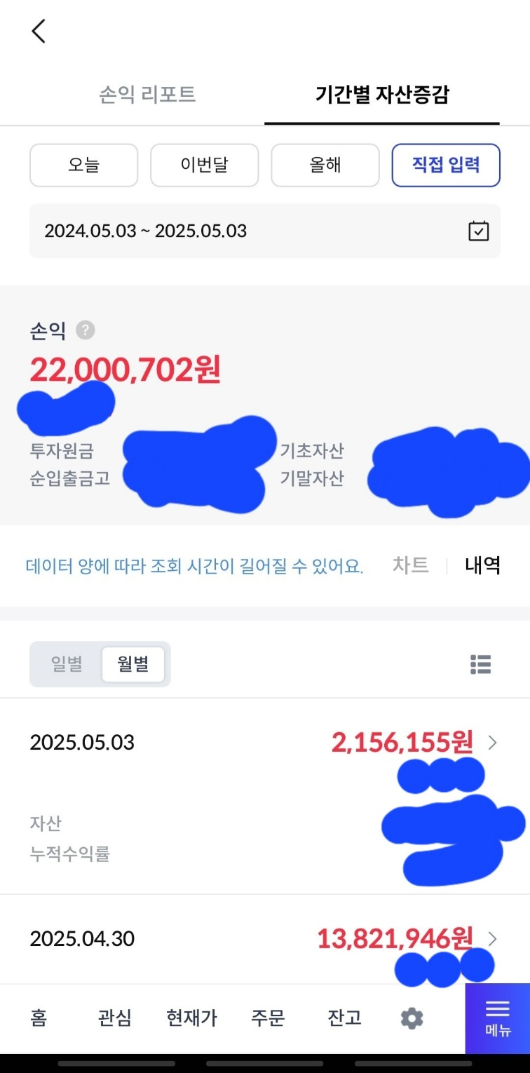 이외에 표기되지 않은 엔/원 & 원/달러 환전 손익까지 24.5.3 ~ 25.5.3 거의 1억에 육박하는 수익을 냈습니다.