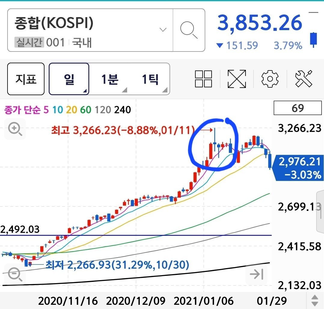 차트 관점에서 고점의 특징이 있는데, 마지막에 평소보다 가파르게 상승하는 경우가 많습니다. 그래서 너무 많이 올라갔다 싶은데 거기에 더 평소보다 큰 양봉이나 과한 상승을 보이면, 고점일 확률이 매우 높습니다. 그래서 저는 저 때 주식 대부분을 팔고 코스피 곱버스를 샀는데, 이건 이후에 다시 언급하겠습니다.